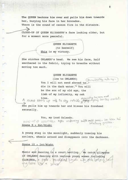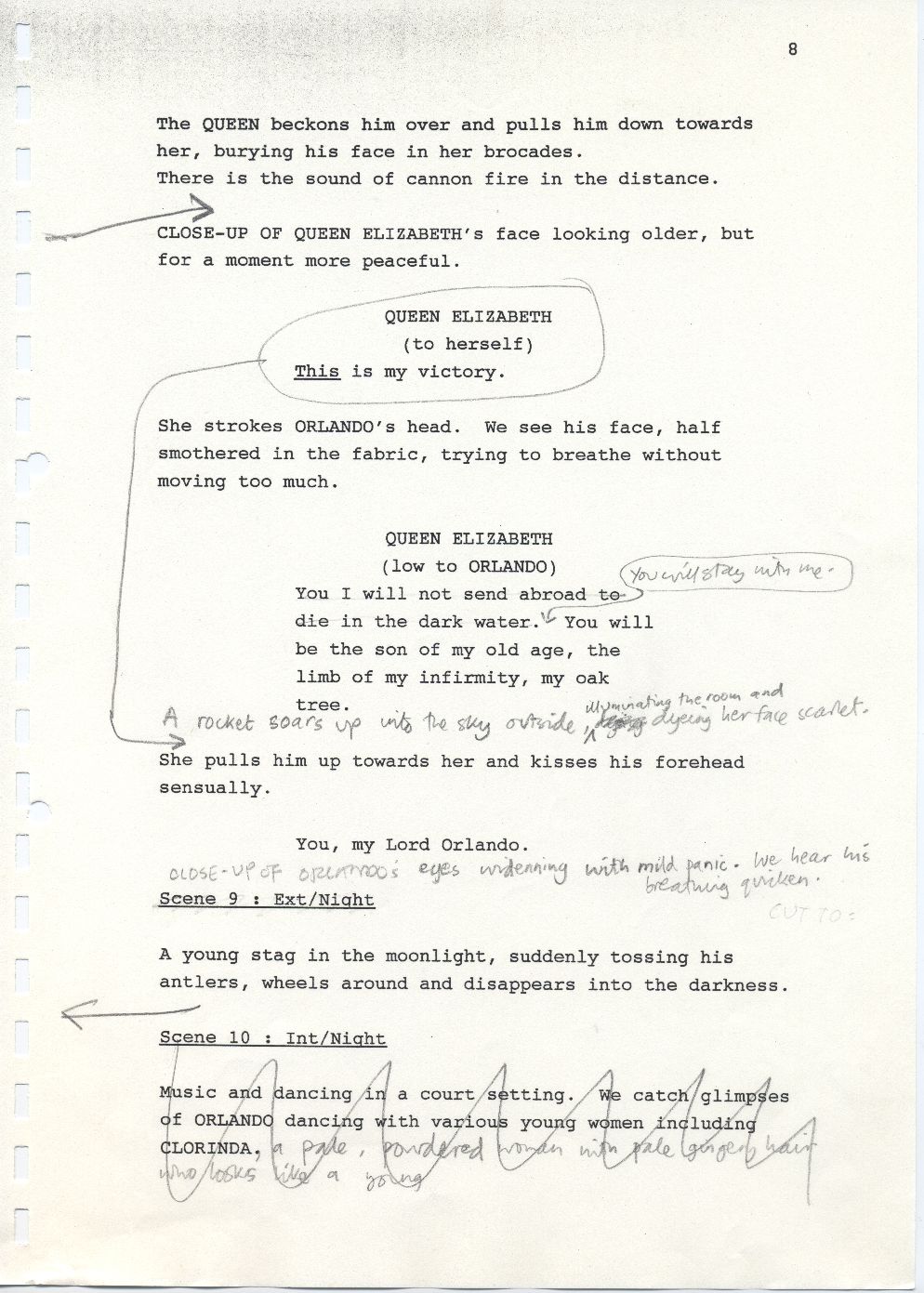 Description Page 8 of second draft script for Orlando. Black printed text with pencil annotations on A4 paper bound with a plastic comb spine