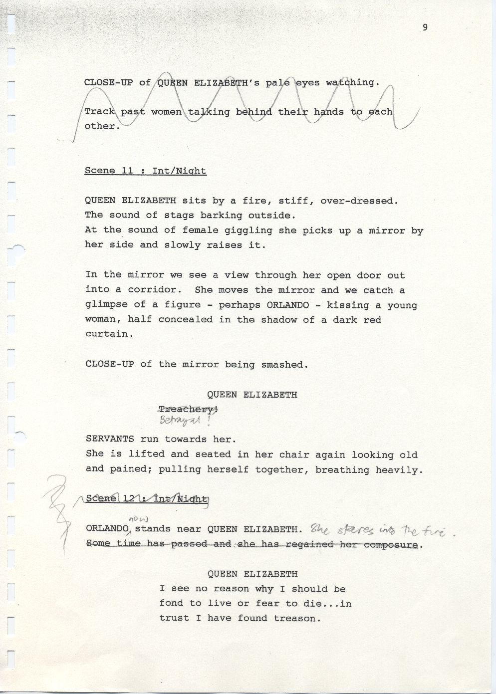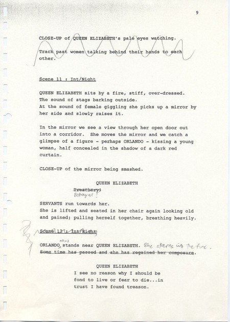 Description Page 9 of second draft script for Orlando. Black printed text with pencil annotations on A4 paper bound with a plastic comb spine