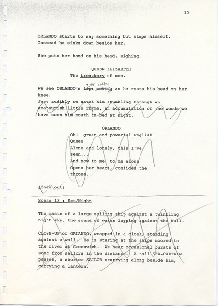 Description Page 10 of second draft script for Orlando. Black printed text with pencil annotations on A4 paper bound with a plastic comb spine