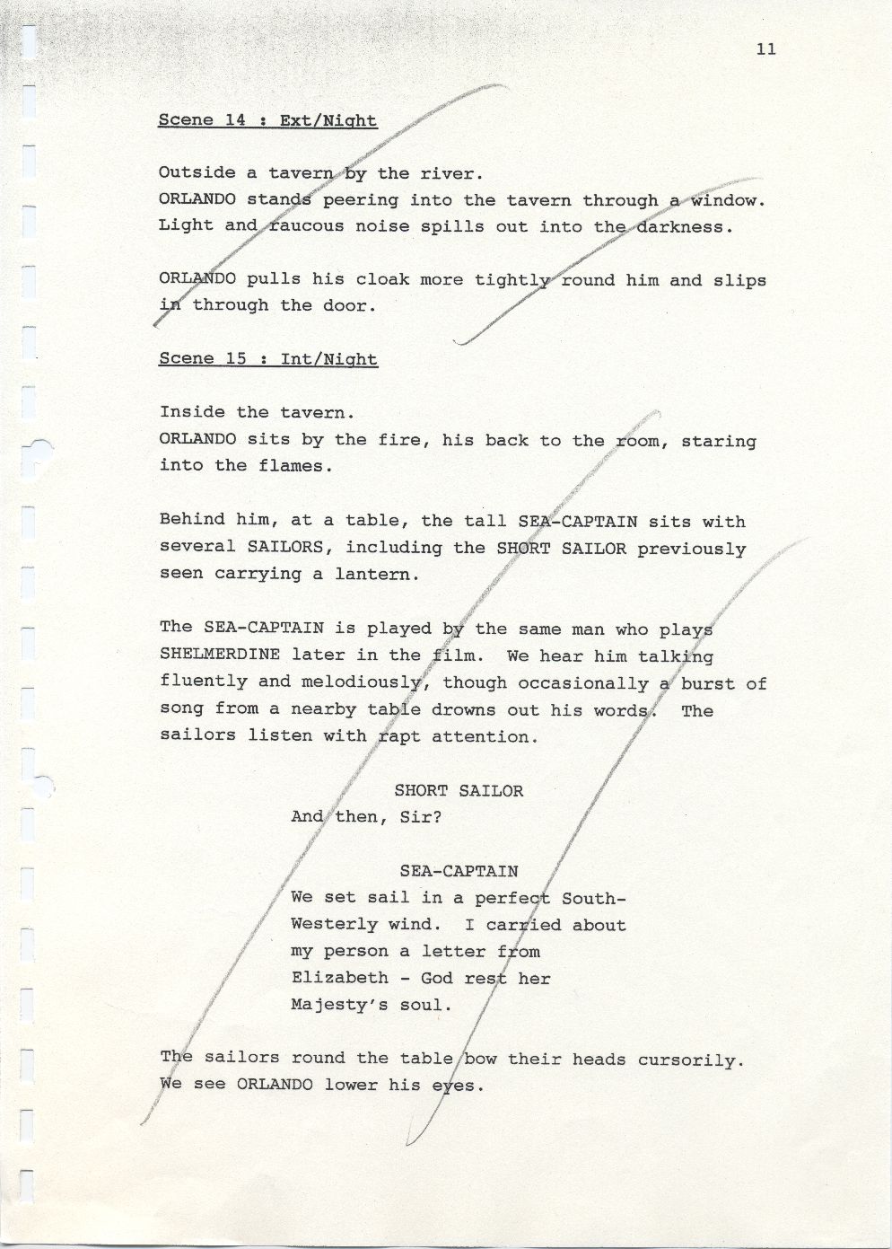 Description Page 11 of second draft script for Orlando. Black printed text with pencil annotations on A4 paper bound with a plastic comb spine