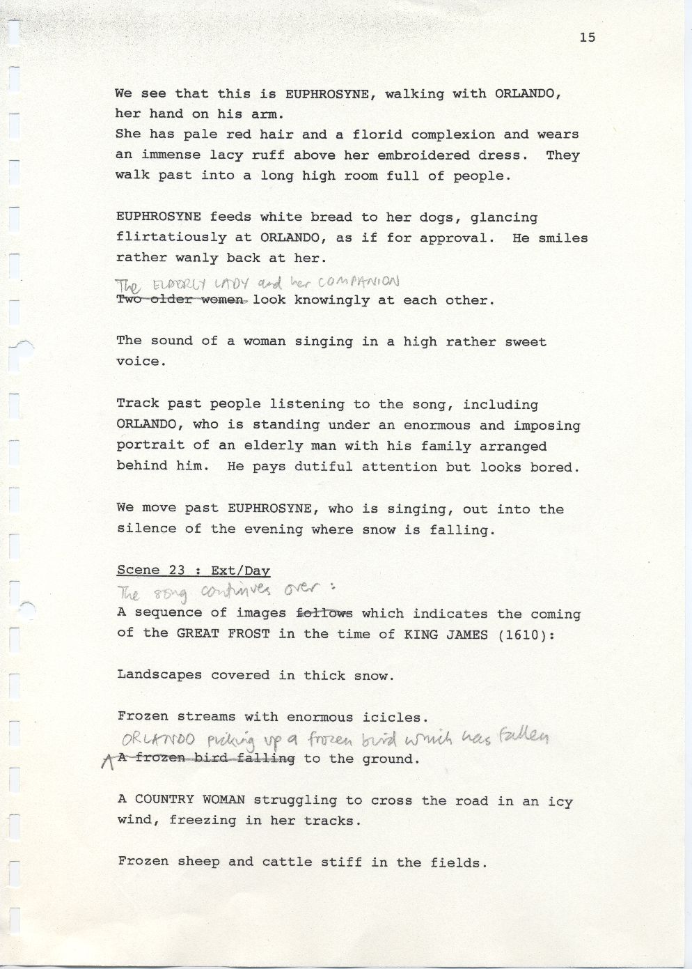 Description Page 15 of second draft script for Orlando. Black printed text with pencil annotations on A4 paper bound with a plastic comb spine