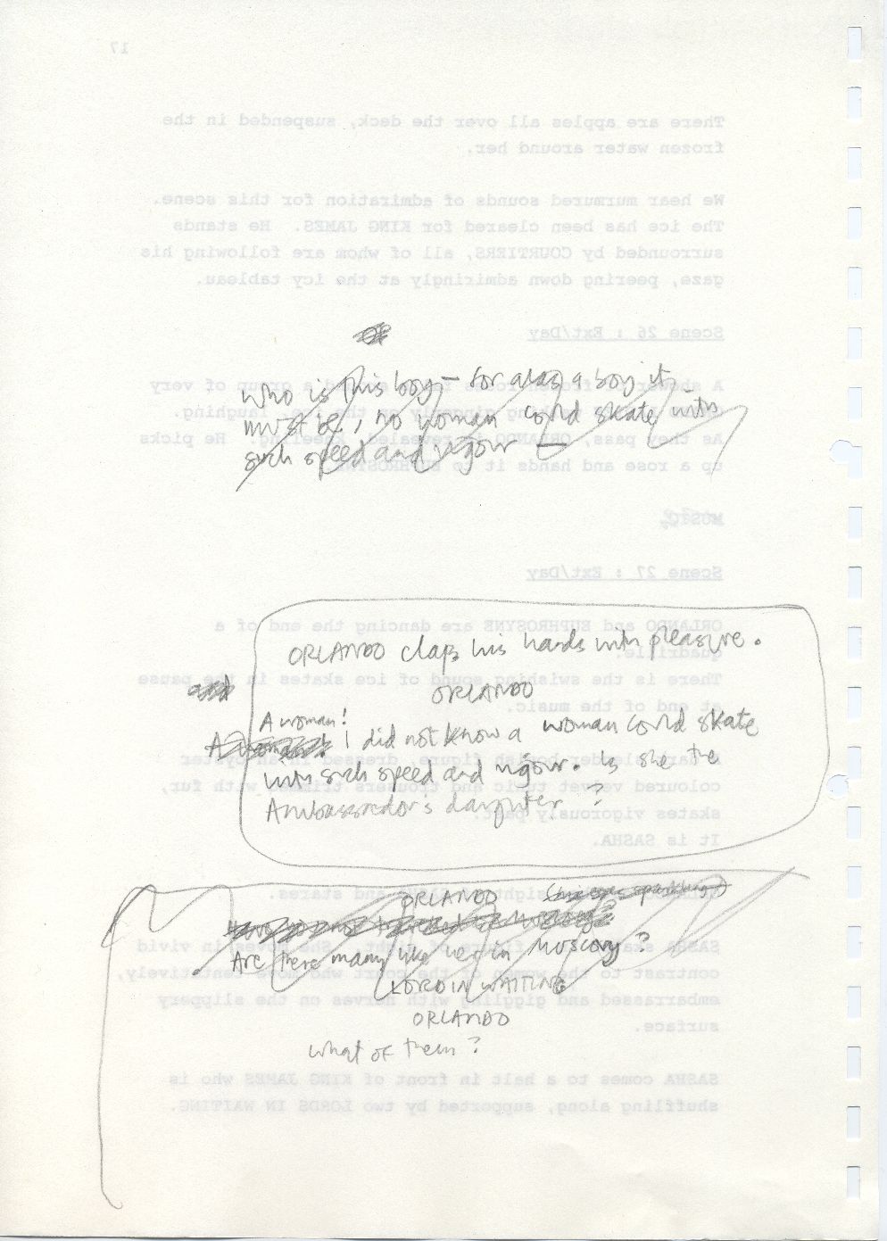 Description Reverse of page 17 of second draft script for Orlando. Handwritten pencil dialogue on A4 paper bound with a plastic comb spine