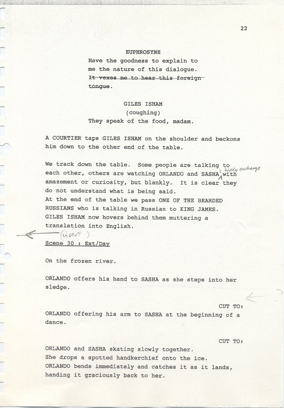 Description Page 22 of second draft script for Orlando. Black printed text with pencil annotations on A4 paper bound with a plastic comb spine