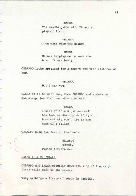 Description Page 31 of second draft script for Orlando. Black printed text with pencil annotations on A4 paper bound with a plastic comb spine