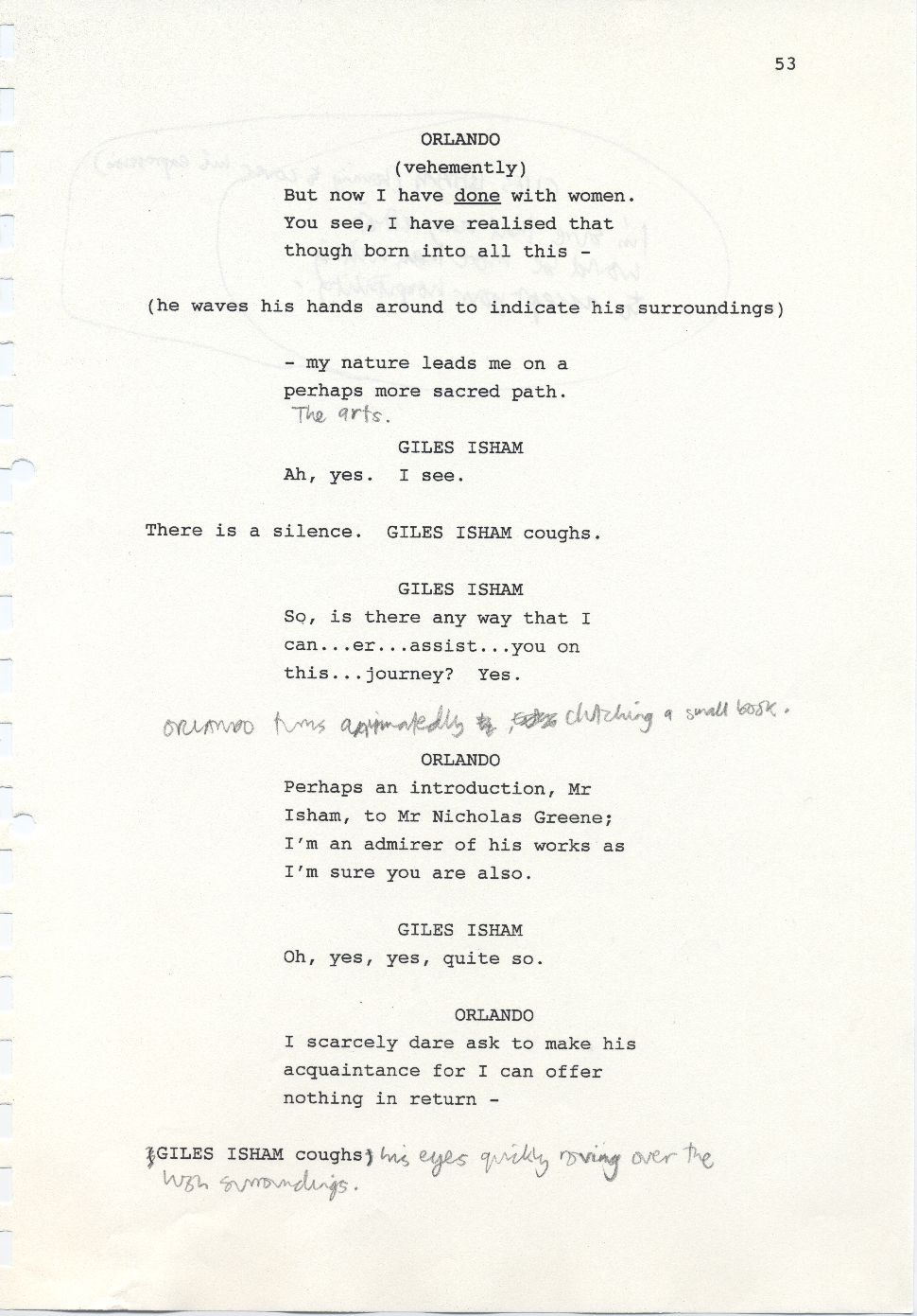 Sally Potter constantly revises her portrayal of Orlando's emotions throughout the development of the film. This pathway displays the numerous changes she decides to make, in turn shaping the cinematic character of Orlando through his/her emotive mannerisms, and will decipher as to why Potter decides to implement these changes in the ways she does so.