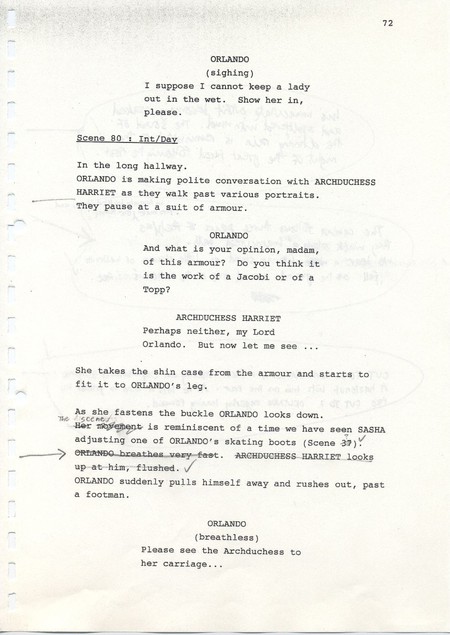 Description Page 72 of second draft script for Orlando. Black printed text with pencil annotations on A4 paper bound with a plastic comb spine.