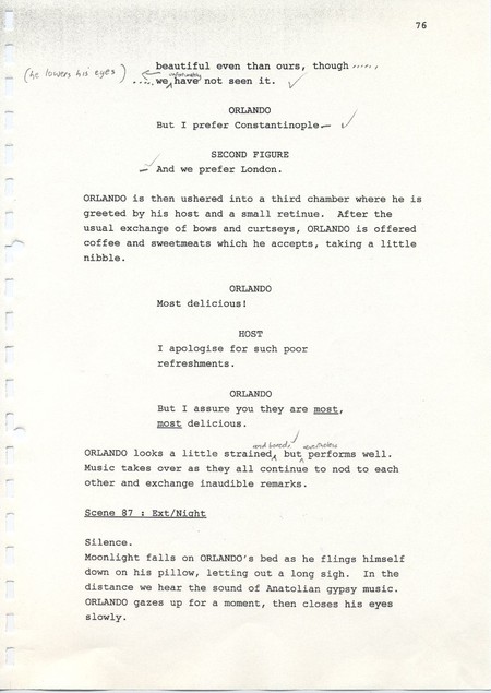 Description Page 76 of second draft script for Orlando. Black printed text with pencil annotations bound with a plastic comb spine.