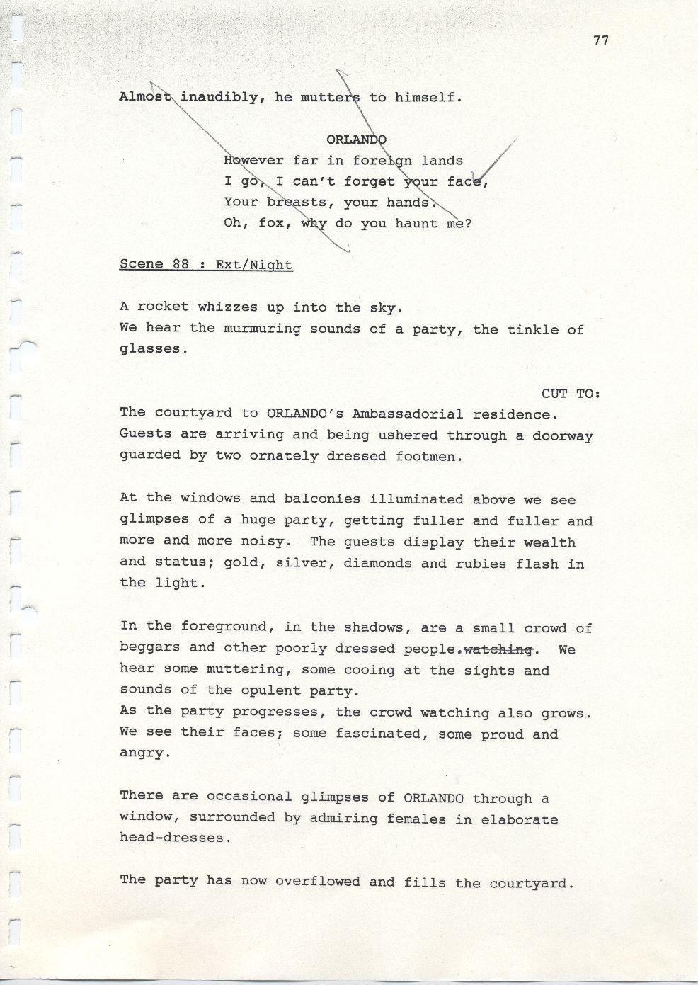 Description Page 77 of second draft script for Orlando. Black printed text with pencil annotations bound with a plastic comb spine.