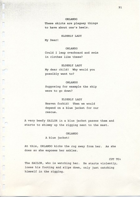Description Page 91 of second draft script for Orlando. Black printed text on A4 paper bound with a plastic comb spine.