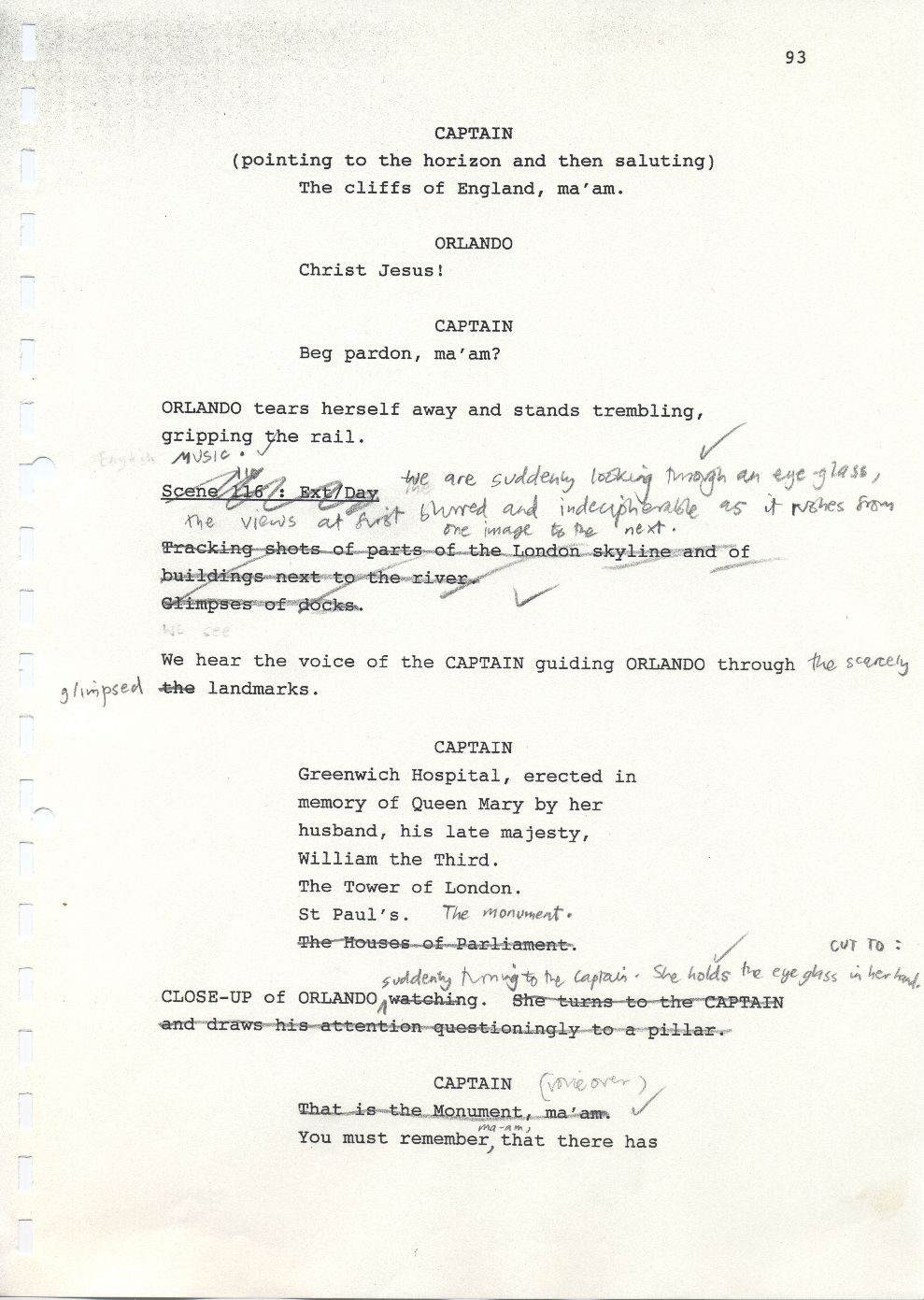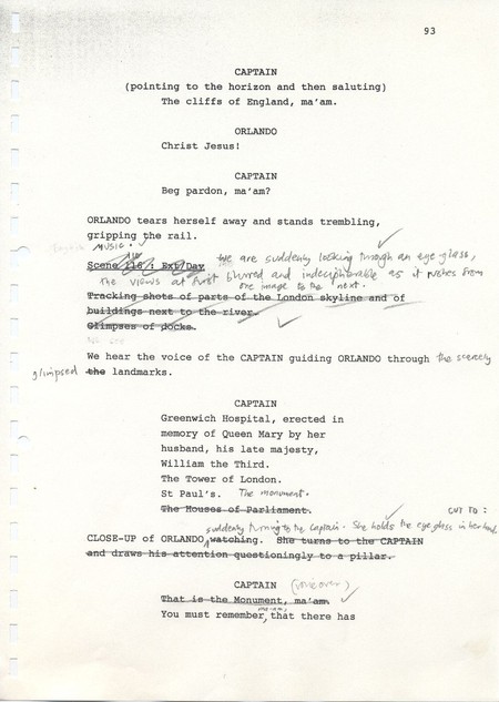 Description Page 93 of second draft script for Orlando. Black printed text with pencil annotations on A4 paper bound with a plastic comb spine.