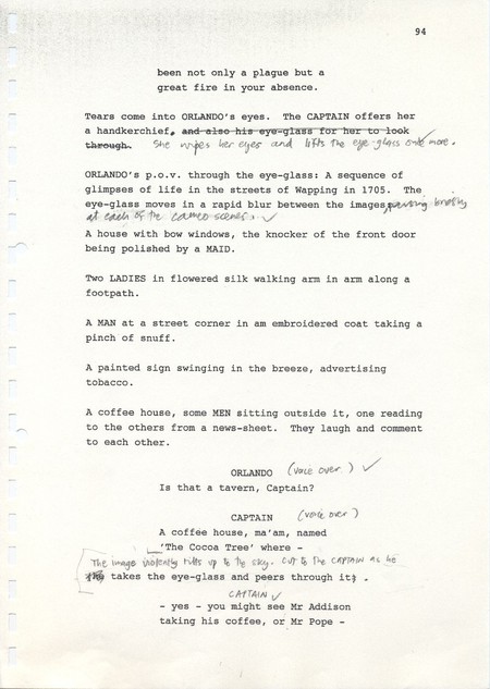 Description Page 94 of second draft script for Orlando. Black printed text with pencil annotations on A4 paper bound by a plastic comb spine.