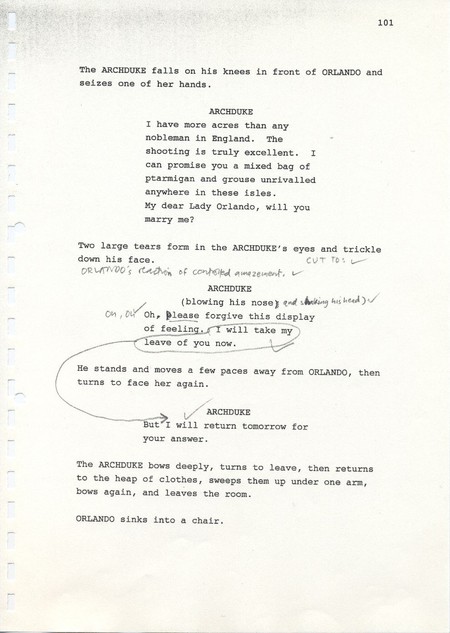 Description Page 101 of second draft script for Orlando. Black printed text with pencil annotations on A4 paper bound with a plastic comb spine.