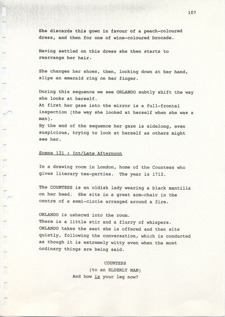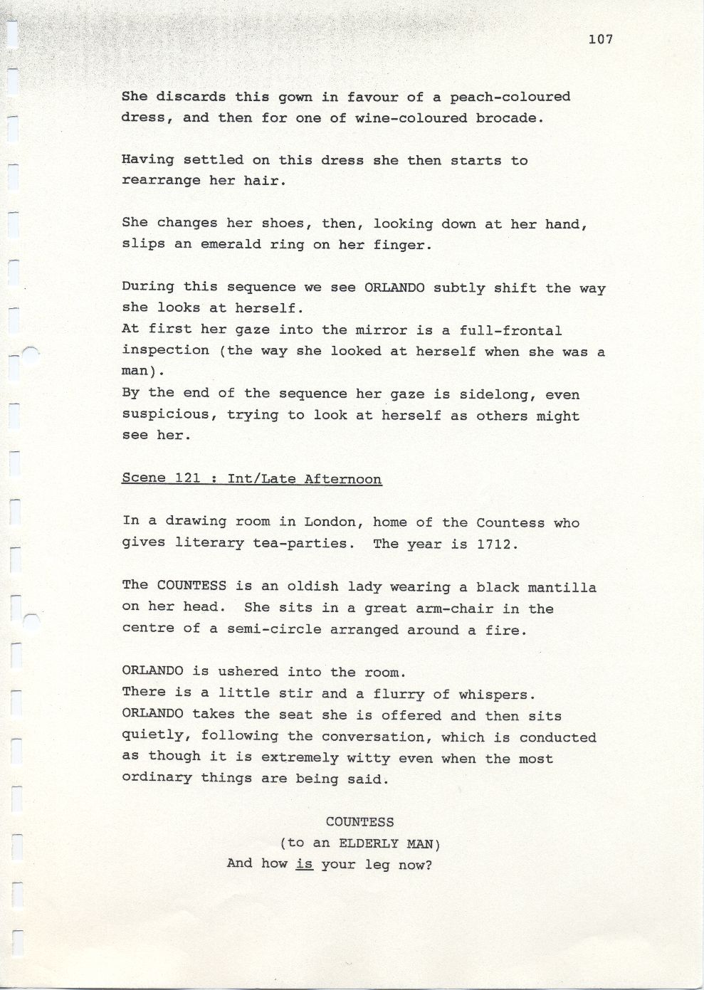 Description Page 107 of second draft script for Orlando. Black printed text on A4 paper bound with a plastic comb spine.