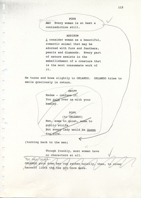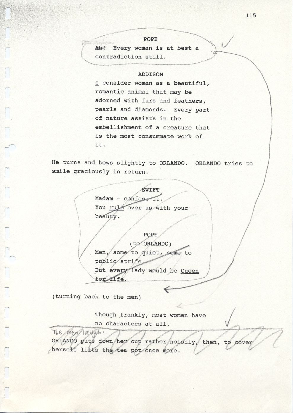 Description Page 115 of second draft script for Orlando. Black printed text with pencil annotations on A4 paper bound with a plastic comb spine.