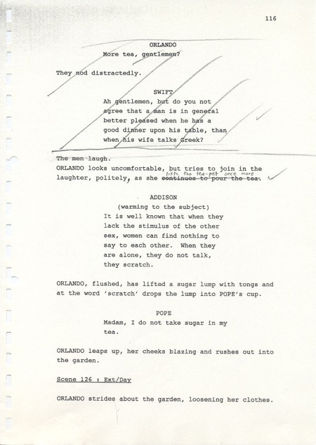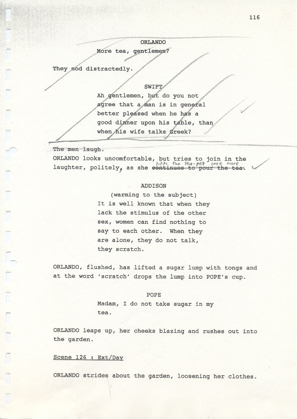 Description Page 116 of second draft script for Orlando. Black printed text with pencil annotations on A4 paper bound with a plastic comb spine.