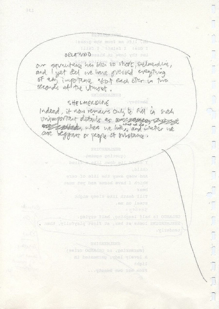 Description Reverse of page 136 of second draft script for Orlando. Handwritten script with pencil on A4 paper bound with a plastic com spine,