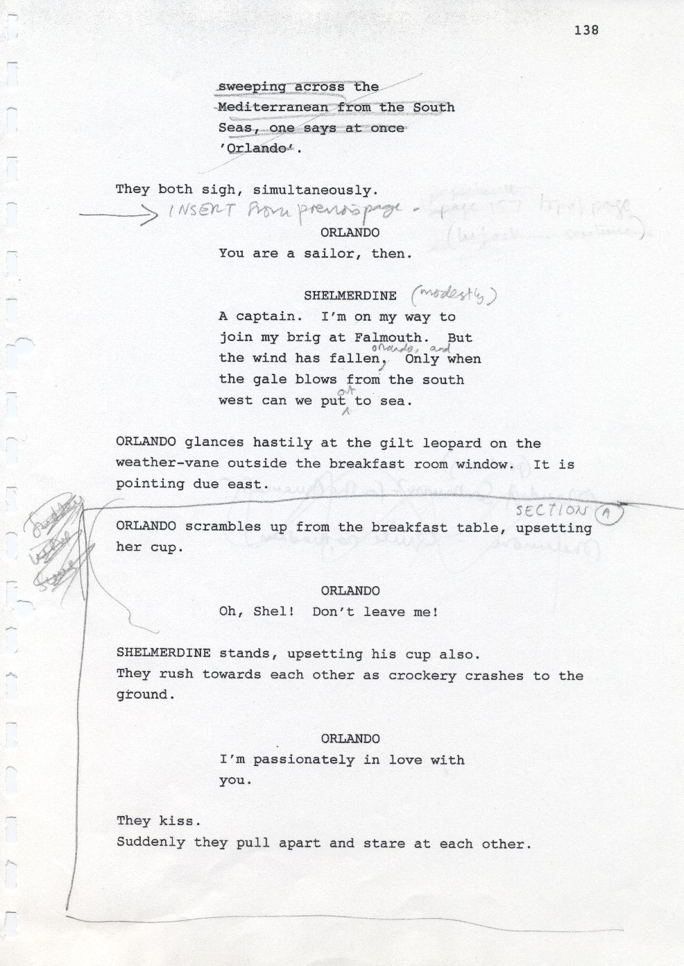 Description Page 138 of second draft script for Orlando. Black printed text with pencil annotations on A4 paper bound with a plastic comb spine.