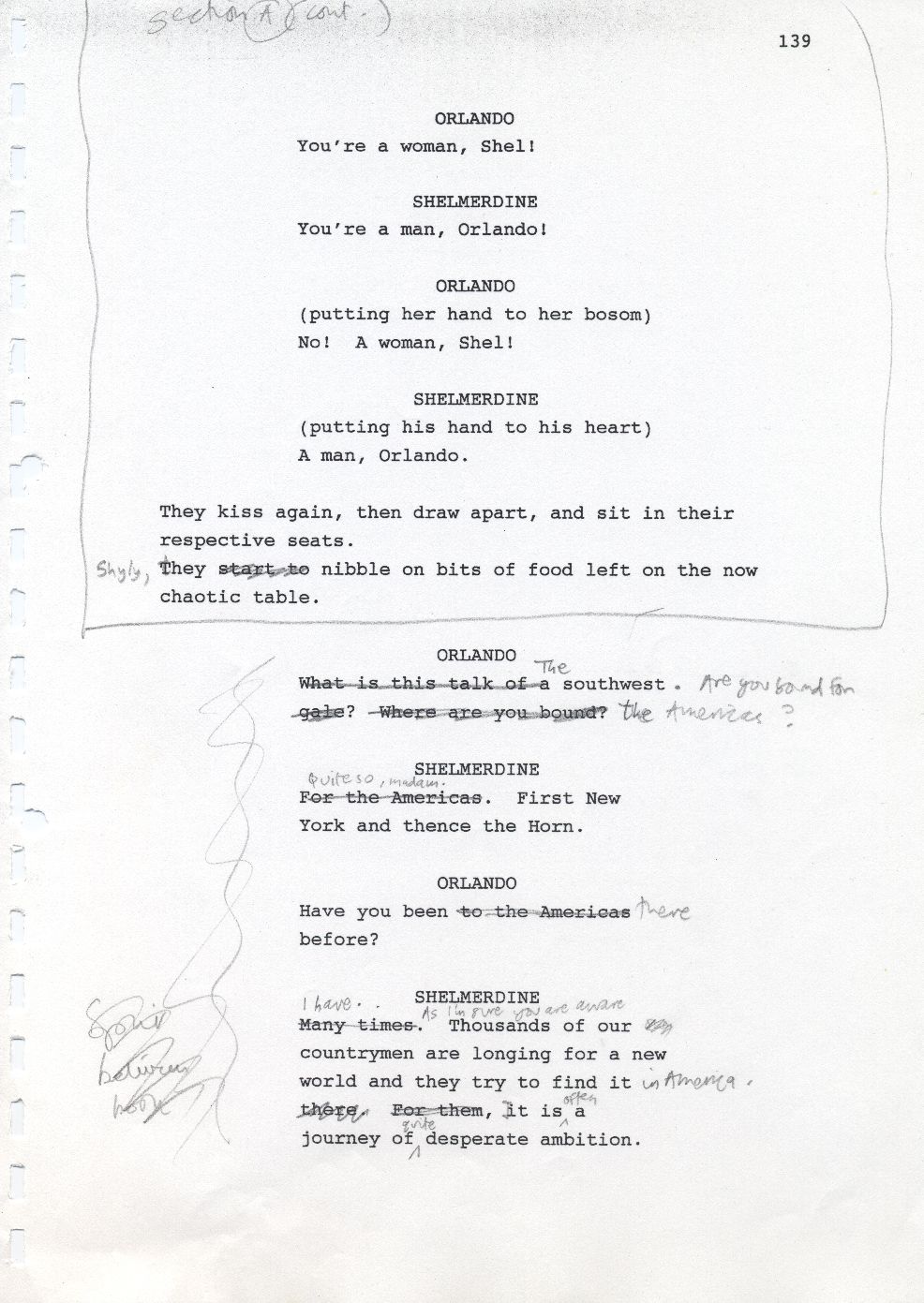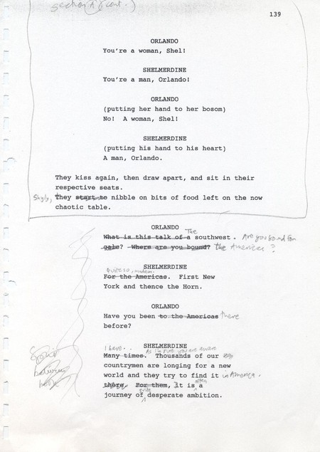 Description Page 139 of second draft script for Orlando. Black printed text with pencil annotations on A4 paper bound with a plastic comb spine.
