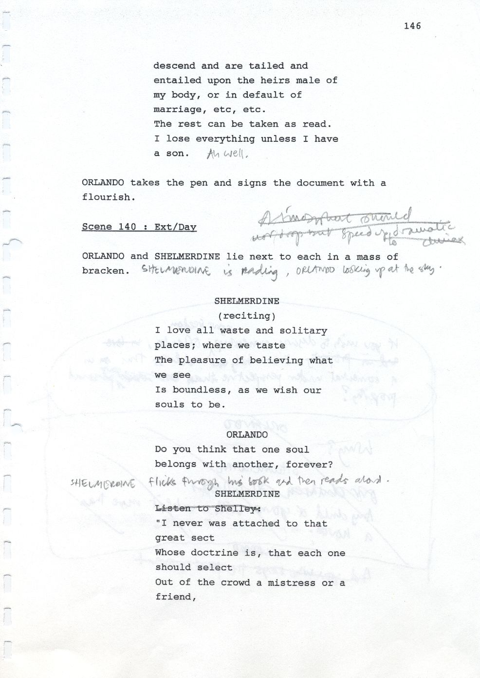 Description Page 146 of second draft script for Orlando. Black printed text with pencil annotations on A4 paper bound with a plastic comb spine.