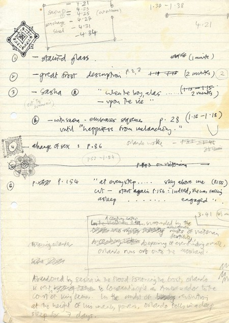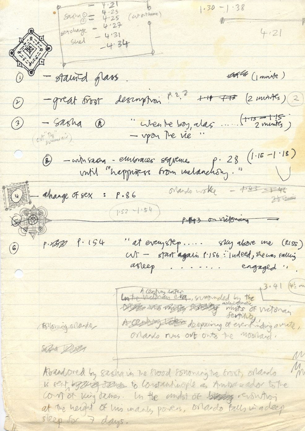 Description Page 6 of early developmental handwritten notes and ideas on Orlando, pencil on a loose leaf of A4 lined paper in pad
