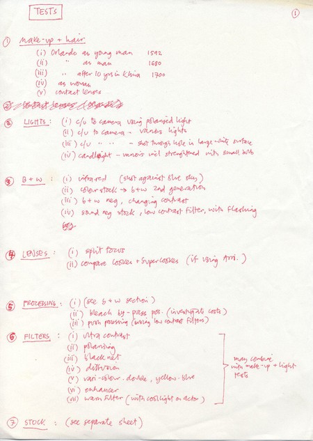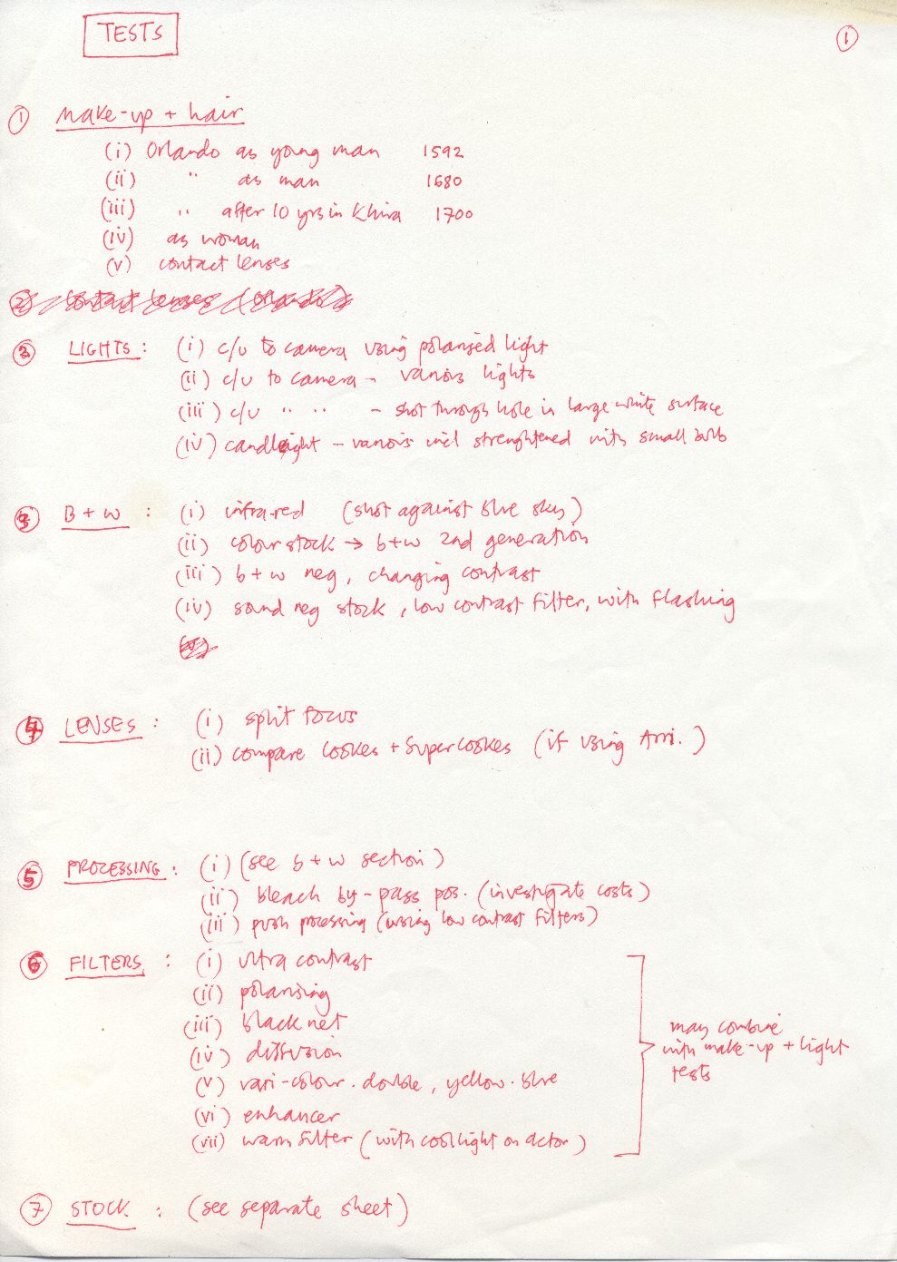 Description Handwritten notes marked "1" in red ink on A4 paper listing make up, hair and lighting tests