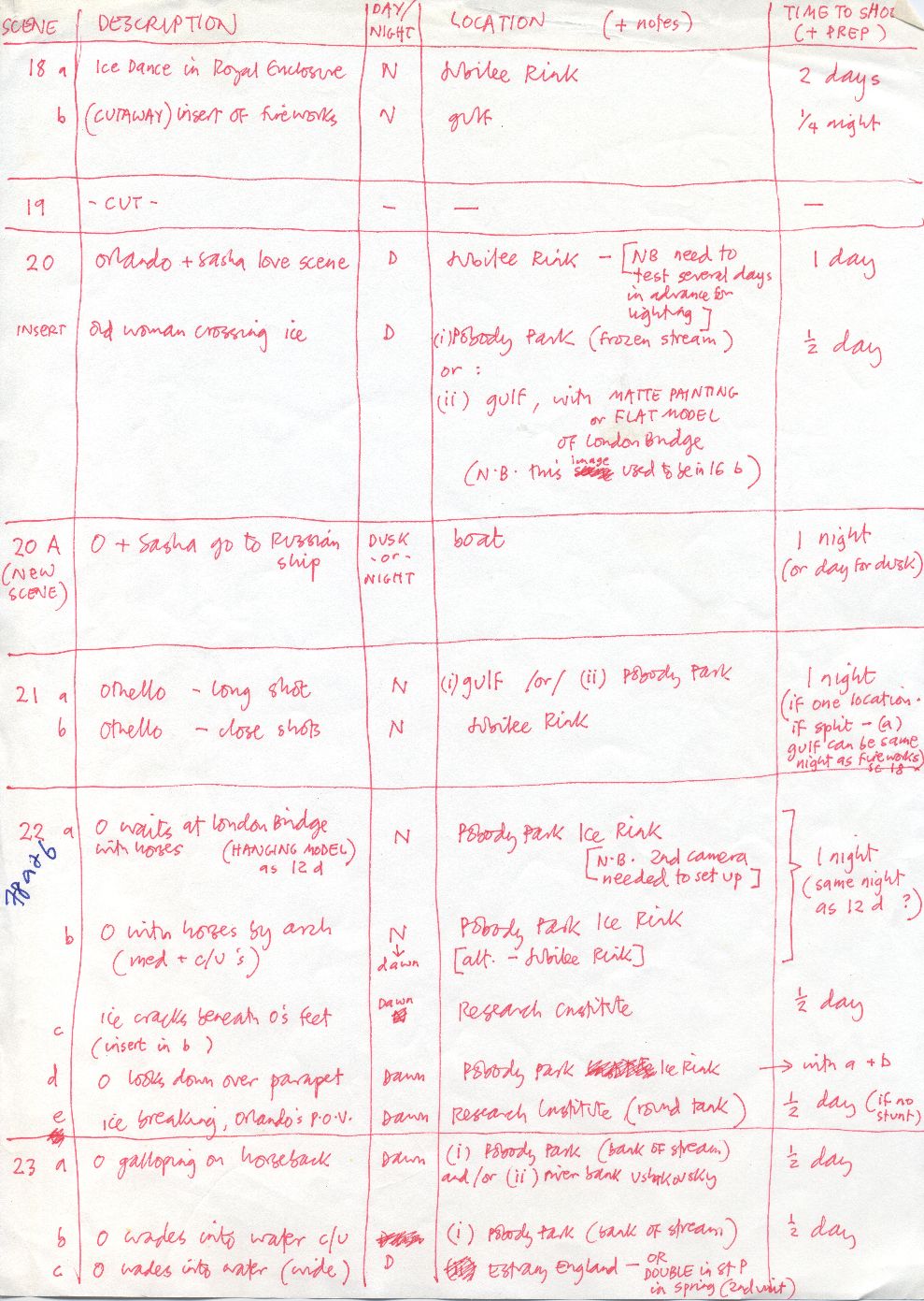 Description Handwritten notes in red ink on A4 paper listing provisional shooting schedule
