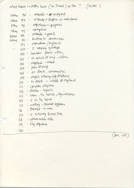 Description Handwritten notes in black ink on white A4 paper listing scenes already written