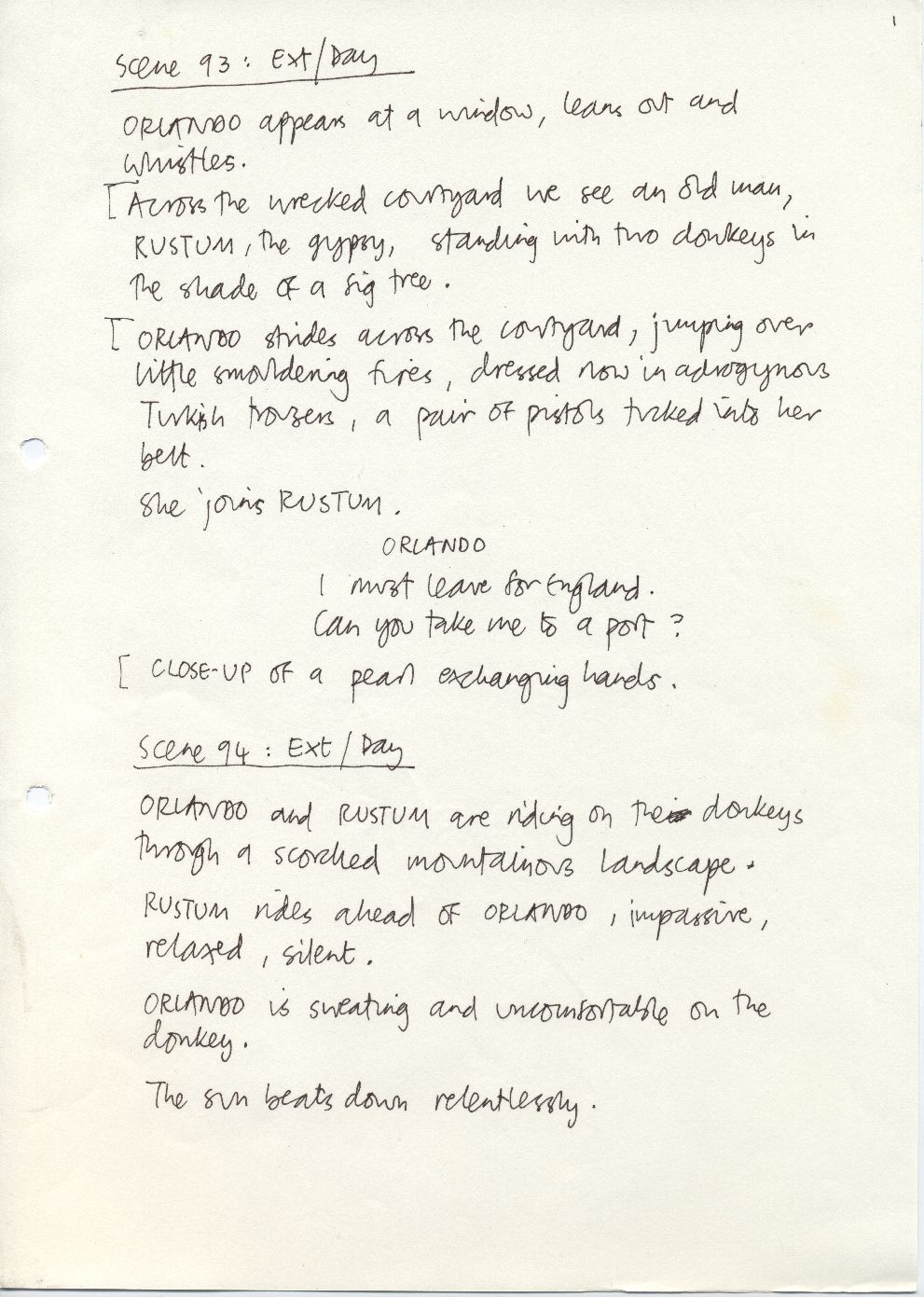 Description Page 1 handwritten rough draft of scenes 93 and 94. Black ink on white A4. Attached to other sheets with paperclip
