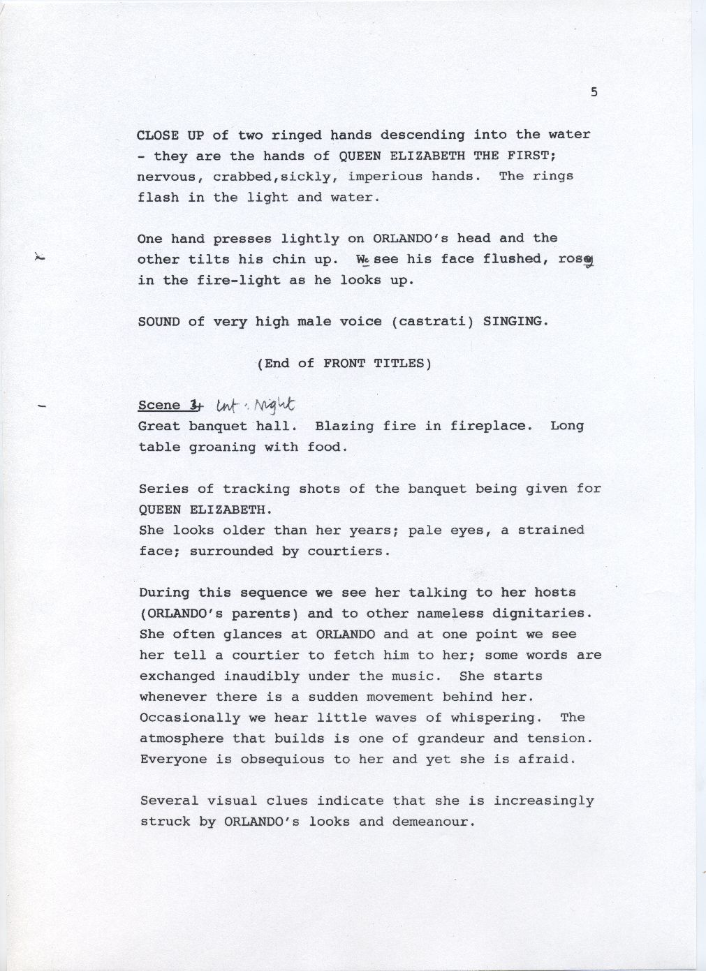 Description Page 5 of rough draft of scene 3 and scene 4. Black text on white A4 with pen annotations.