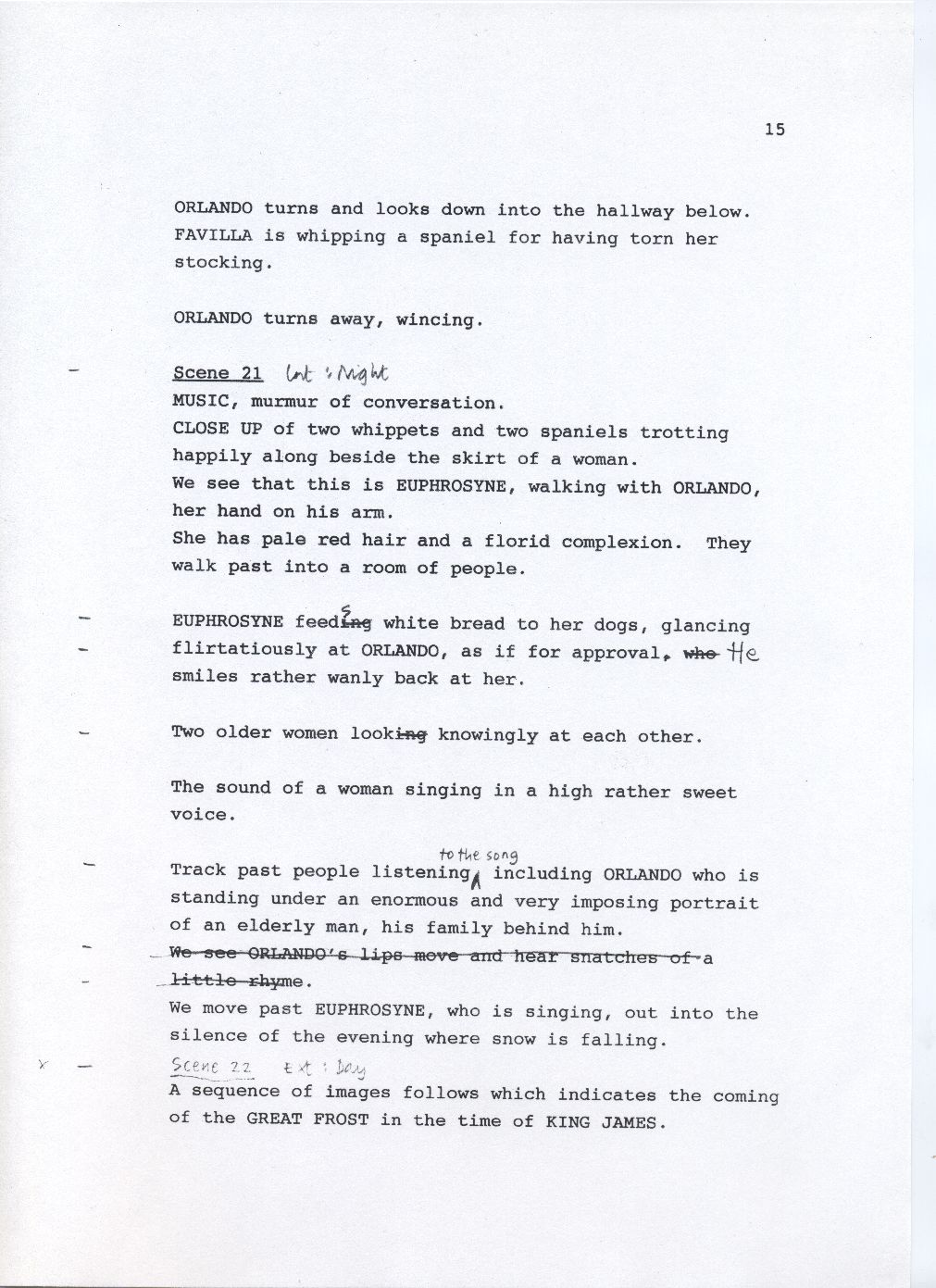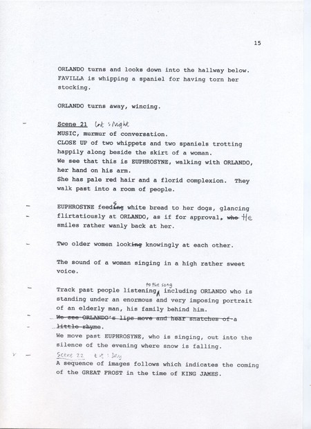 Description Page 15 of rough draft of scene 21, scene 22. Black text on white A4 with pen annotations.