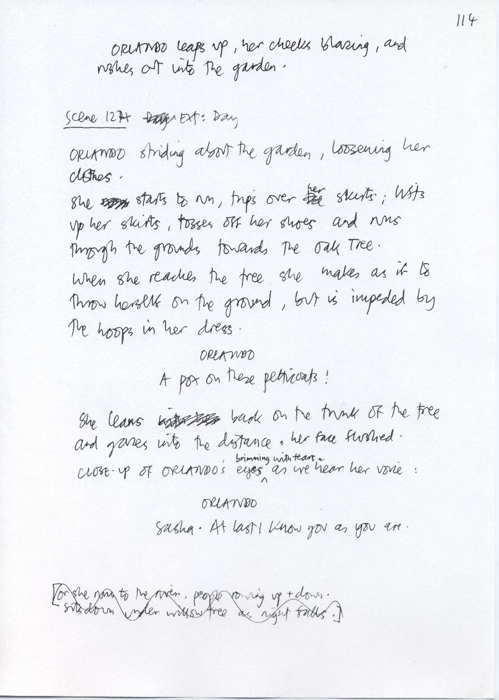 Description Page 114 of rough draft of scene 123, scene 124. Hand written in black ink with pen annotations.