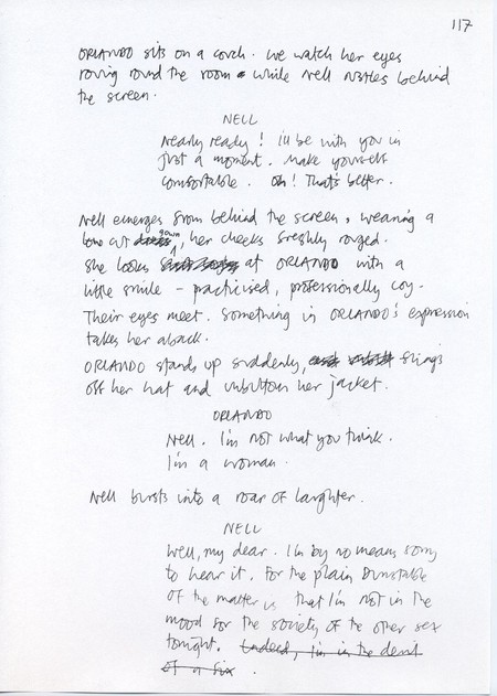Description Page 117 of rough draft of scene 128. Hand written in black ink with pen annotations.