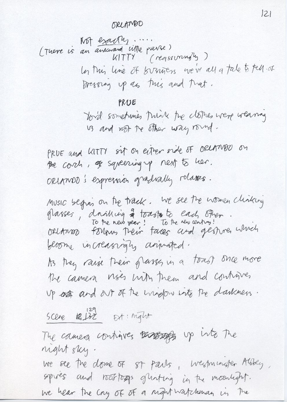 Description Page 121 of rough draft of scene 128, scene 129. Hand written in black ink with pen annotations.