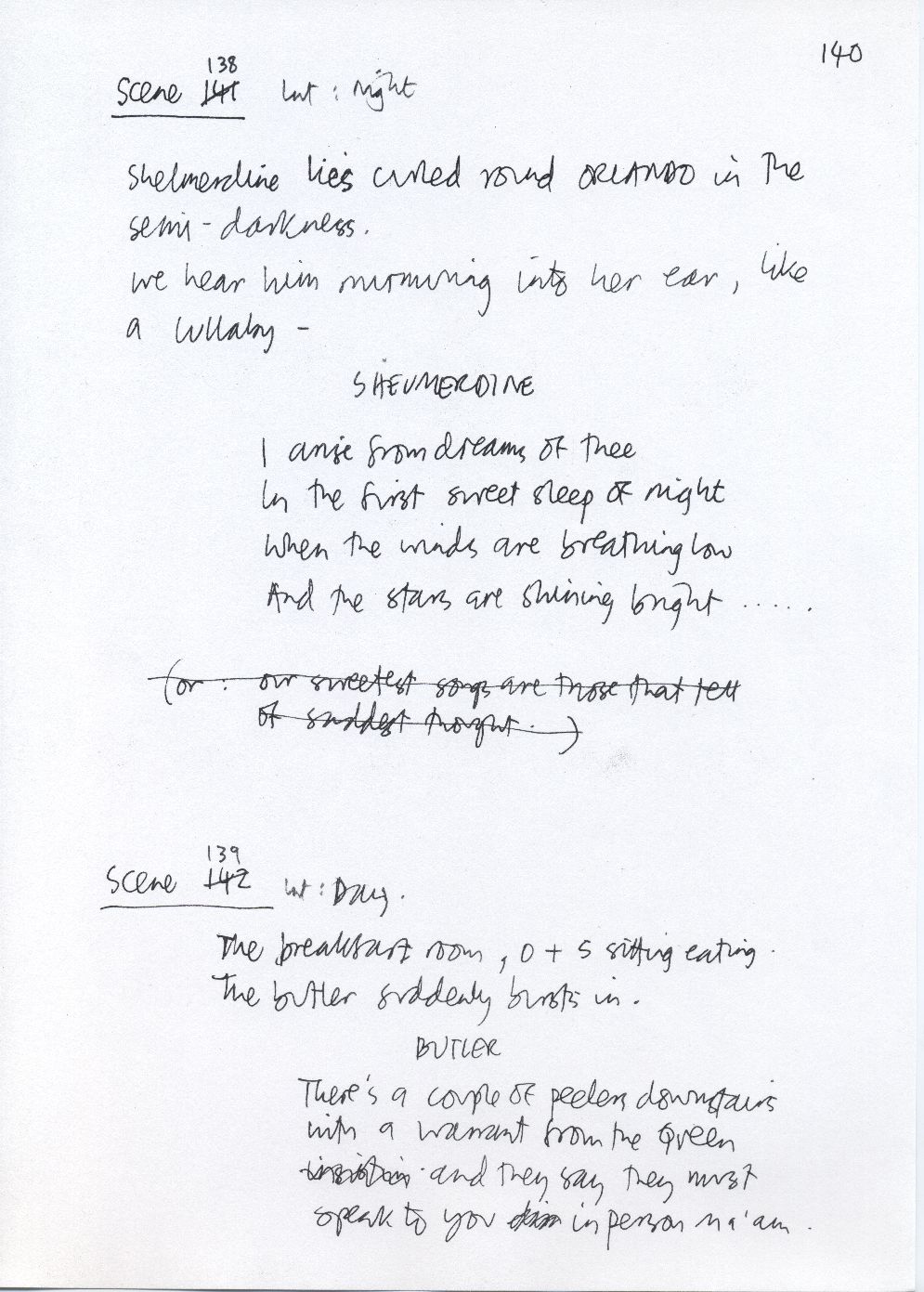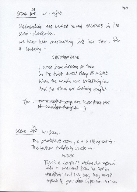 Description Page 140 of rough draft of scene 138, scene 139. Hand written in black ink with pen annotations.