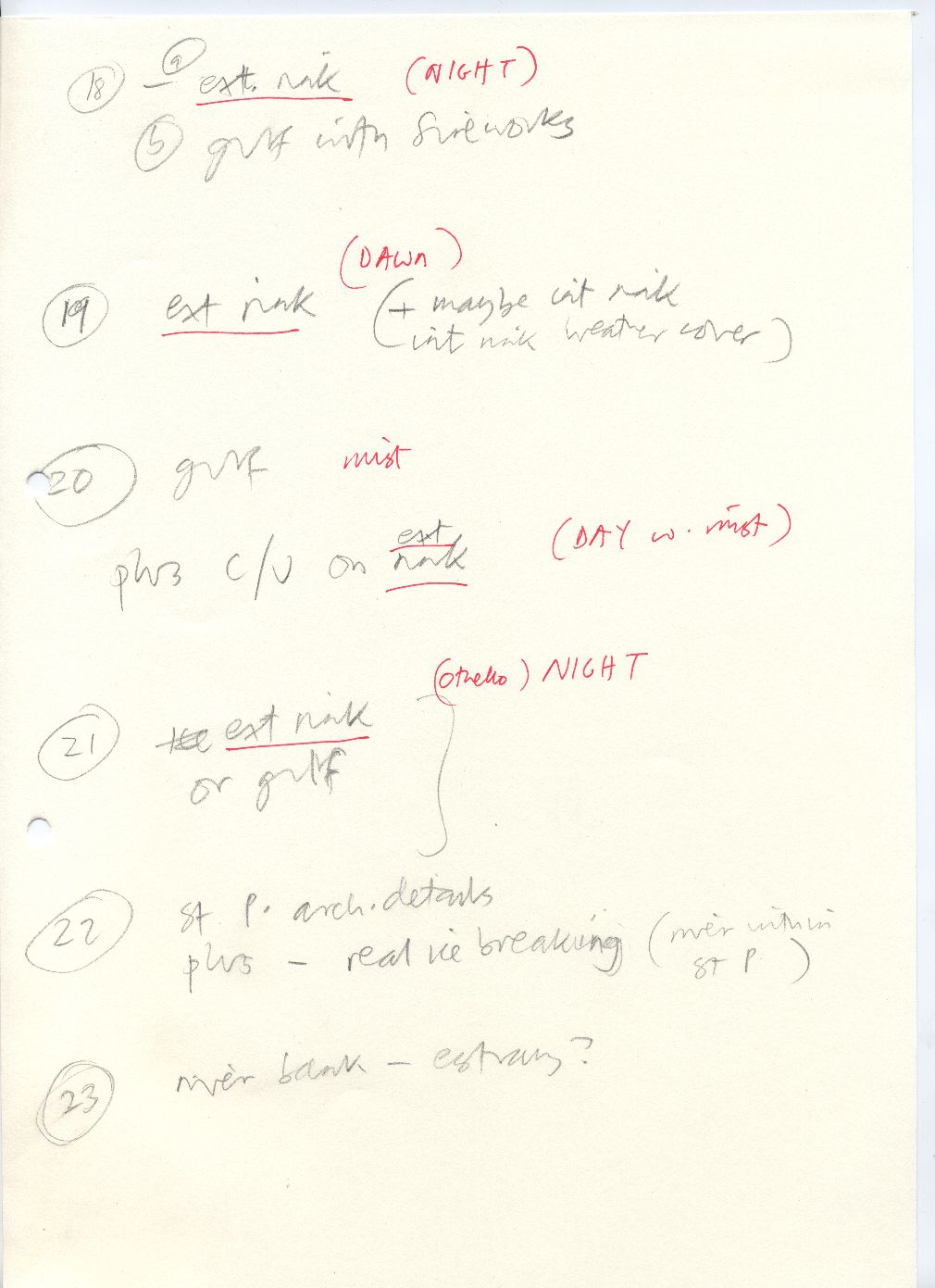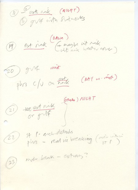 Description List of props, effects and set design needed for scene 18, scene 19, scene 20, scene 21, scene 22, scene 23. Hand written A4 sheet.