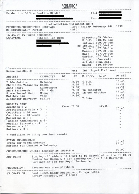 Description Page 1 of pre-production call sheet #8. Typed A4 sheet