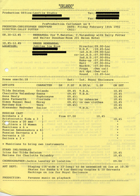 Description Copy of pre-production call sheet #8. Photocopy on yellow A4 paper.