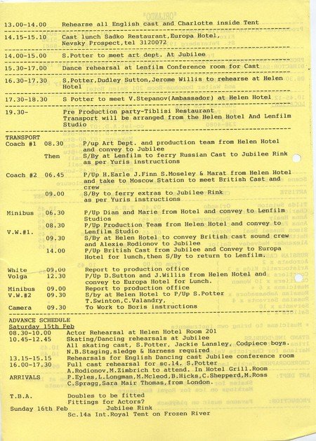 Description Copy of page 2 of pre-production call sheet #8. Photocopy on yellow A4 paper