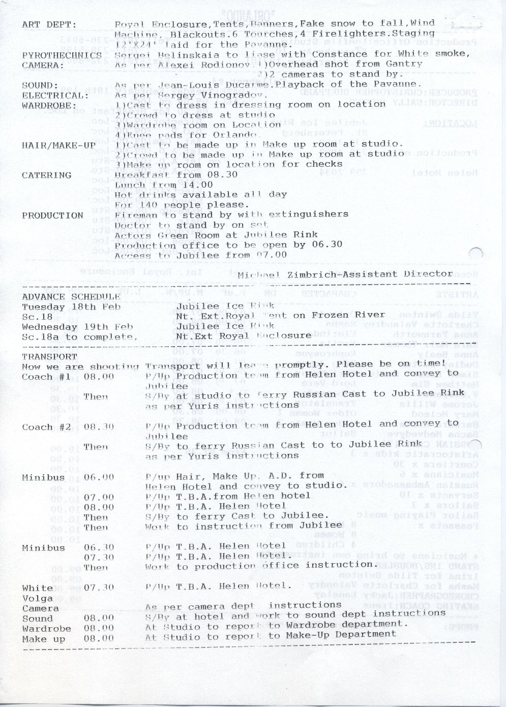 Description Reverse of production call sheet #3. Typed A4 sheet.
