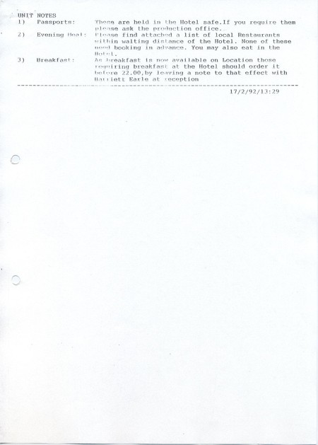Description Page 2 of Production call sheet #3. Typed A4 sheet.