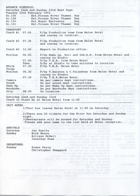 Description Reverse of production call sheet # 7. Typed A4 sheet