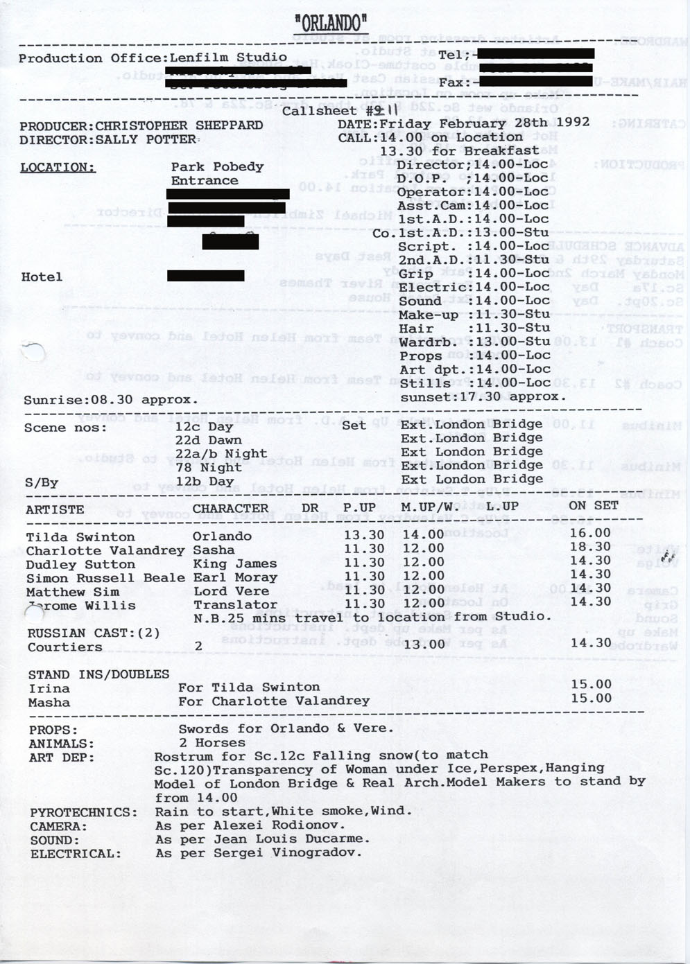 Description Production call sheet #11. Typed A4 sheet with pencil annotations