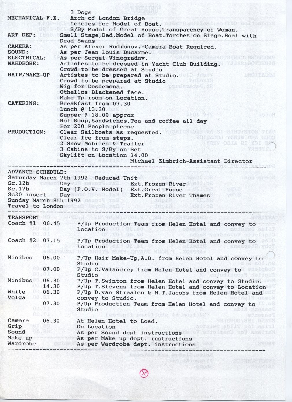 Description Reverse of production call sheet #16. Typed A4 sheet