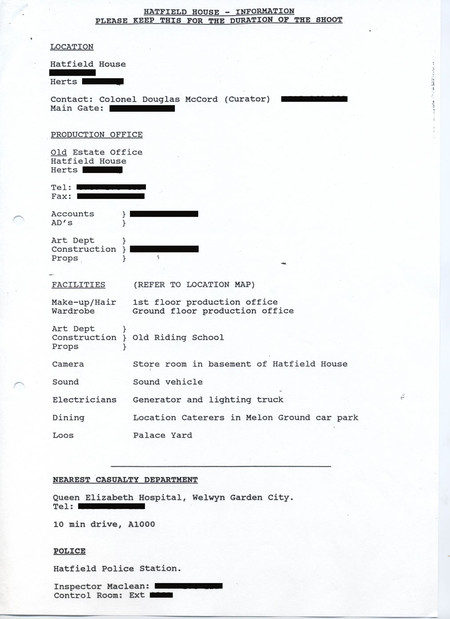 Description Typed A4 sheet headed Hatfield House Information page 1