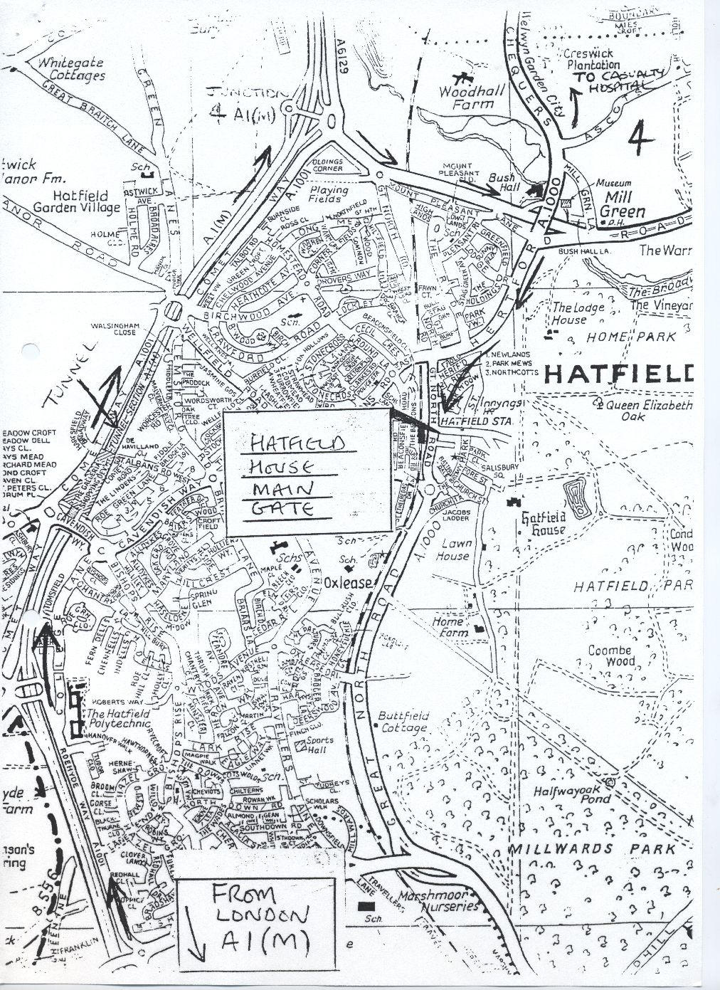 Description Page 8 of Hatfield House Information. Photocopy of map of route from London with handwritten annotations