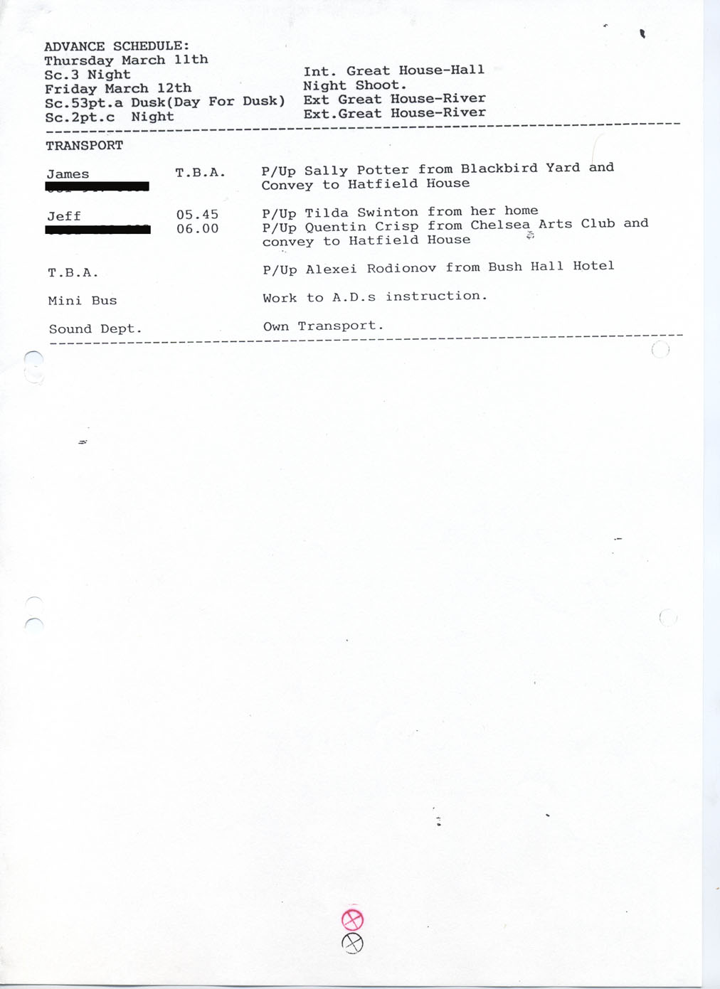 Description Reverse of production call sheet #18. Typed A4 sheet