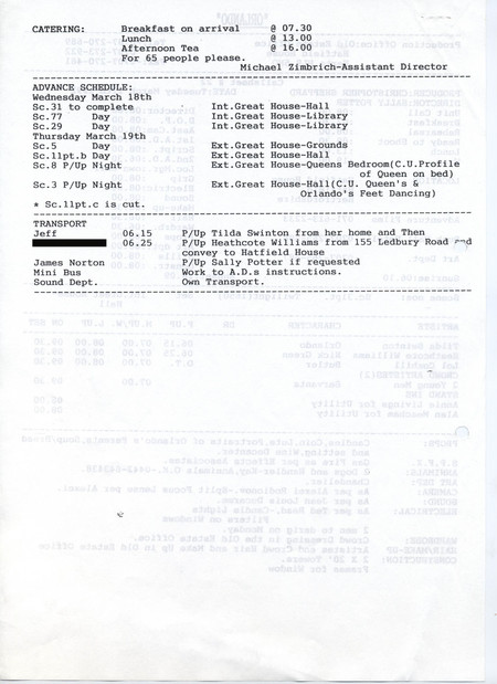 Description Reverse of production call sheet #22. Typed A4 sheet