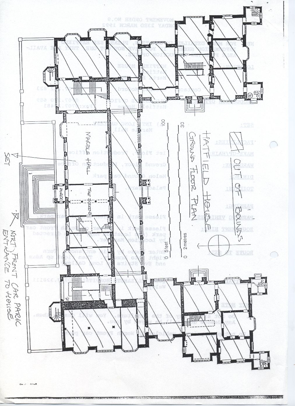 Description Reverse of Movement Order No.9. Printed map of Hatfield House with hadnwritten annotations. Photocopied A4 sheet.