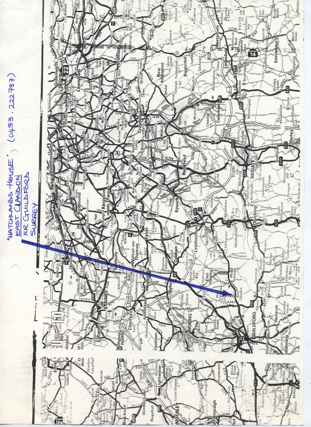 Description Printed Route map for Hatchlands location with Handwritten annotation. Purple ink on black and white map. Photocopied A4 sheet.