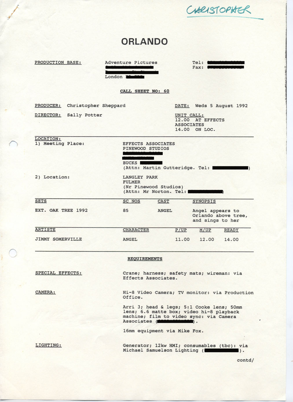 Description Production call sheet #60, page 1. Typed A4 sheet